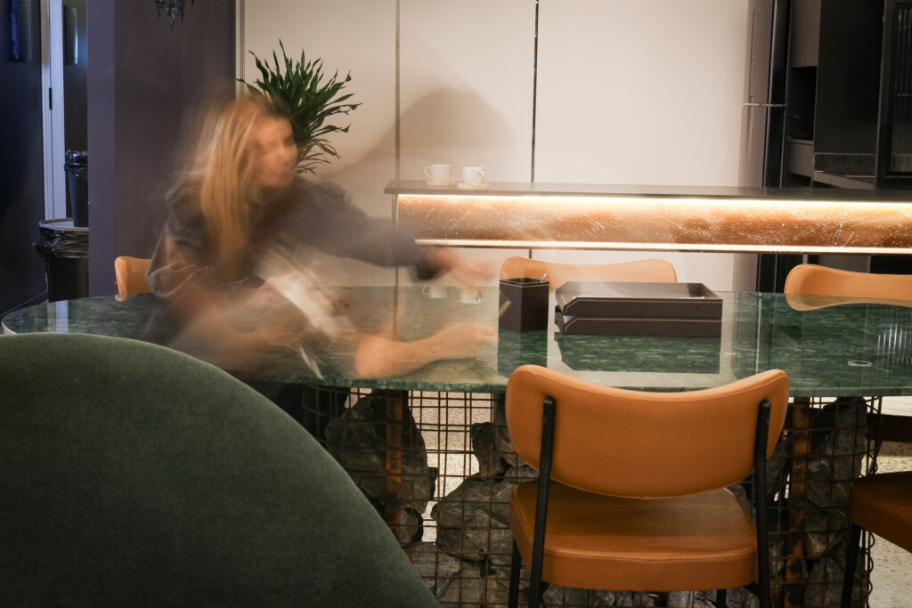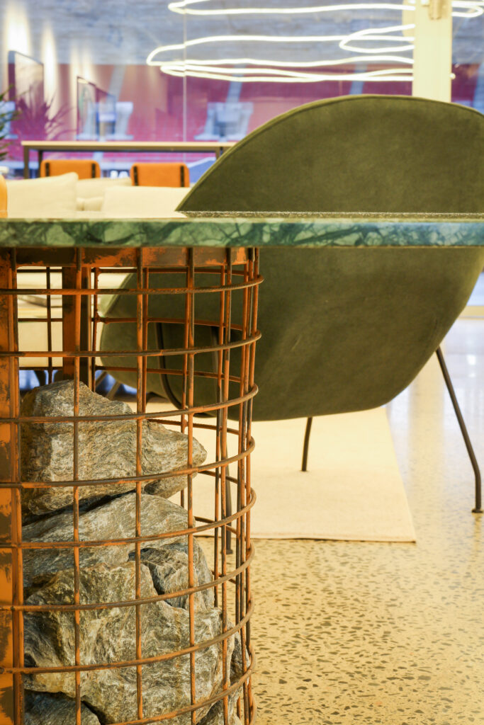 O escritório-lounge se destacou pelo apelo da experiência visual com a iluminação curva e divertida, assim como a exploração do tato, com texturas confortáveis e tapetes que acolhem e trazem a sensação de divisão em ambientes de speaking.